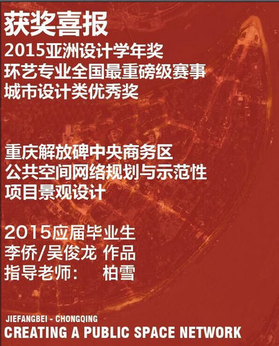 2015年10月30日,亚洲城市与建筑联盟、亚洲设计学年奖组委会公布2015亚洲设计学年奖获奖名单,星空棋牌苹果版环境艺术设计专业2015应届毕业生李侨、吴俊龙的《重庆解放碑中央商务区公共空间网络规划与示范性项目景观设计》获2015亚洲设计学年奖城市设计奖优秀奖。获奖作品的指导老师为星空棋牌苹果版环境艺术设计专业柏雪副教授。