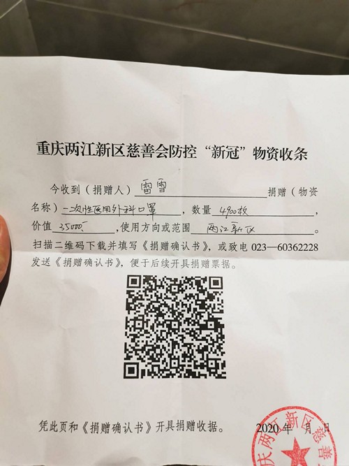 在得知重庆医院缺乏抗击疫情医用物资后,她心急如焚,四处筹集。在做好自我防护的情况下,她发动家人、亲人、朋友、同学等在各大购物平台寻找购买。在筹集到口罩后,第一时间将物资捐赠给了重庆两江新区慈善会。
