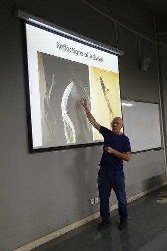 肖恩·克拉克为重艺学子讲授的学术讲座名为《玻璃艺术的历史和在当代的商业运用》,他以图文并茂的方式,为几百名重艺学子勾勒了玻璃及玻璃艺术的产生、发展史,介绍了戴尔·奇胡利等当代玻璃艺术大师的创作与商业成就,为同学们了解这一色彩斑斓的艺术领域打开了视窗、开阔了眼界。(文 朝夫/摄影 圈圈)
