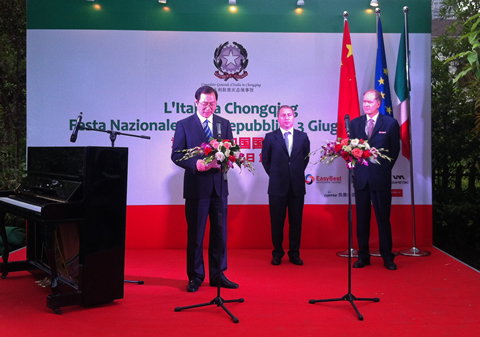 6月3日,意大利驻重庆总领事馆首次在重庆举办意大利国庆日活动,意大利驻华大使白达宁(上图右)和重庆市副市长刘强(上图左)出席了活动开幕式。