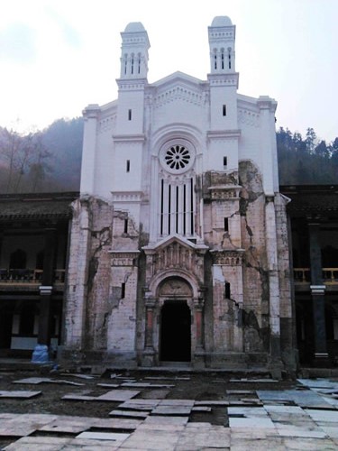 5.12地震前的"上书院"天主教堂(资料照片) 恢复重建的"上书院"天主教堂