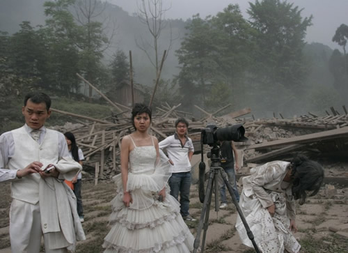 5.12地震发生时,在"上书院"外拍摄婚纱照的幸存新人(资料照片)