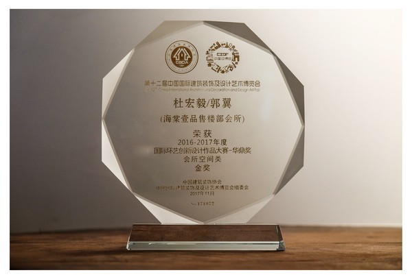 我校艺术设计学院副院长、教授杜宏毅与郭翼共同设计的"海棠壹品售楼部会所",在2017年11月参加由中国建筑装饰协会、中国国际建筑装饰及设计艺术博览会主办的第十二届中国国际建筑装饰及设计艺术博览会中,荣获2016-2017年度国际环艺创新设计作品大赛华鼎奖会所空间类金奖。