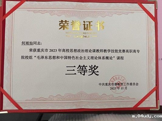 2023年10月,由重庆市委教育工作委员会、重庆市总工会主办,重庆大学、重庆师范大学、重庆交通大学等七所高校承办的重庆市2023年高校思想政治理论课教师教学能力竞赛圆满落下帷幕。全市27所本科院校、44所高职高专院校共200余名思政课教师进行了为期两天的包括《习近平新时代中国特色社会主义思想概论》《思想道德与法治》《毛泽东思想和中国特色社会主义理论体系概论》等七门课程的教学技能大比拼。经过激烈角逐,我校公共课教学部思政课教师何雨灿荣获高职高专院校组《毛泽东思想和中国特色社会主义体系概论》课程三等奖。