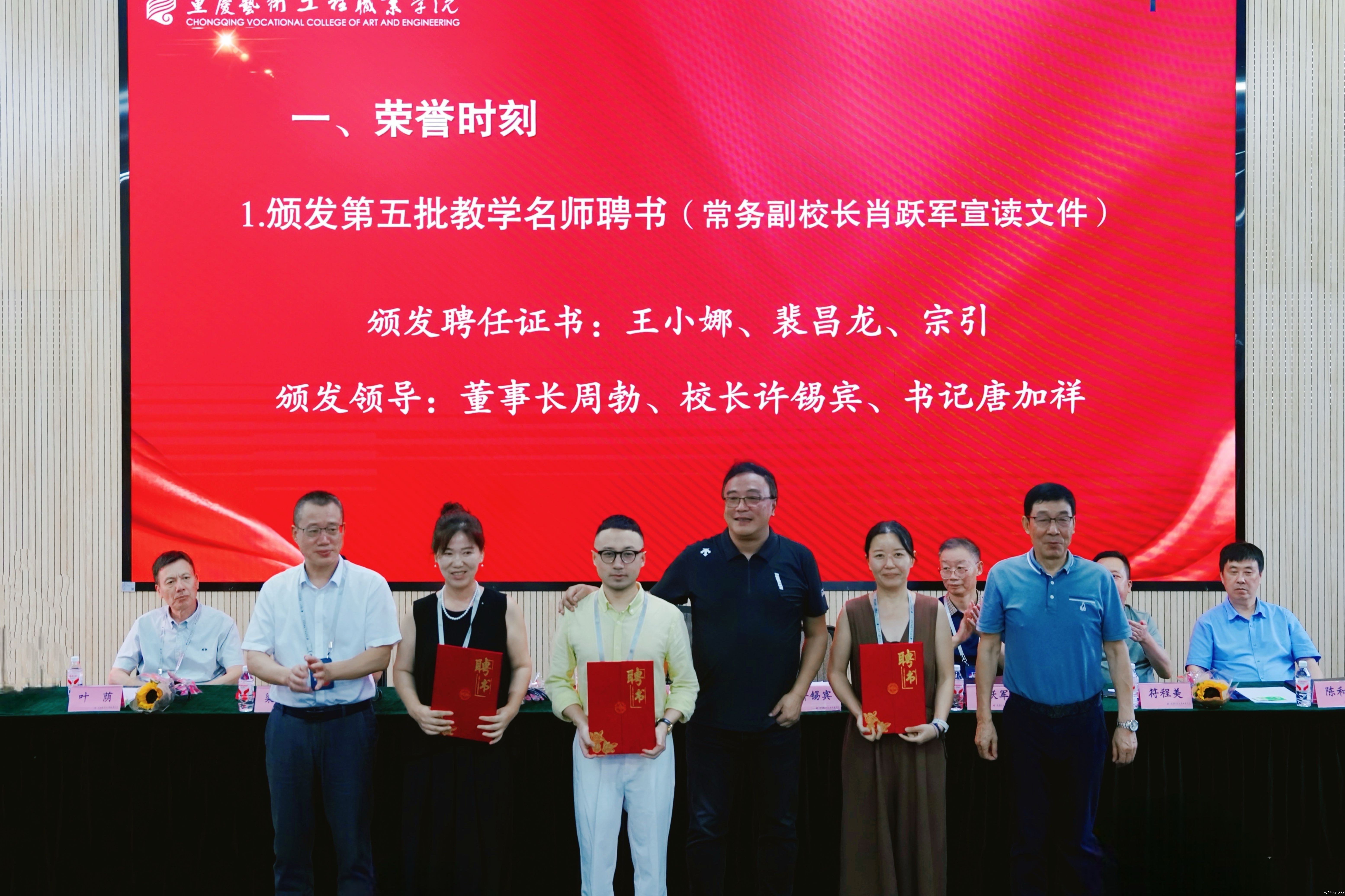 活动首先举行聘任和颁奖仪式。肖跃军宣读了第五批教学名师的聘任文件。随后,周勃、许锡宾、唐加祥三位领导共同为王小娜、裴昌龙、宗引3位教师颁发教学名师聘书。