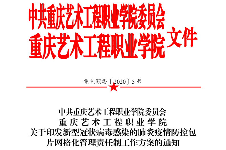 学校及时成立重庆艺术工程学院新型冠状病毒感染的肺炎疫情防控工作领导小组,负责全校新型冠状病毒感染的肺炎防控工作的统一组织领导、统筹协调,并设立重庆艺术工程学院新型冠状病毒感染的肺炎疫情防控工作领导小组办公室,印发《星空棋牌苹果版新型冠状病毒感染的肺炎防控工作方案(试行)》、《星空棋牌苹果版新型冠状病毒感染的肺炎疫情防控包片网格化管理责任制工作方案》等文件。