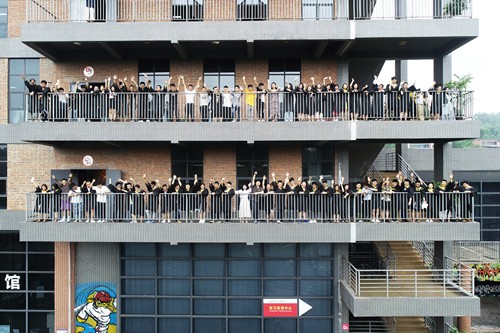 建筑工程学院毕业生在实训大楼和运动场用无人机拍摄自己的毕业纪念照(摄影 陈志伟)